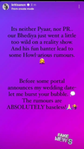 क्रितीने इंस्टा स्टोरीवर शेअर करत नोटमध्ये लिहिले की, “हे प्रेमही नाहीये आणि पीआरही नाहीये. आमचा भेडिया एका रियॅलिटी शोमध्ये जरा जास्तच जंगली झाला आहे. त्याने मजेशीर चेष्टेने काही ओरडणाऱ्या अफवांना जन्म दिला आहे. यापूर्वीही कोणत्यातरी पोर्टलने माझ्या लग्नाची तारीख जाहीर केली होती. मला तुमचा फुगा फोडू द्या. अफवा आधारहीन आहेत